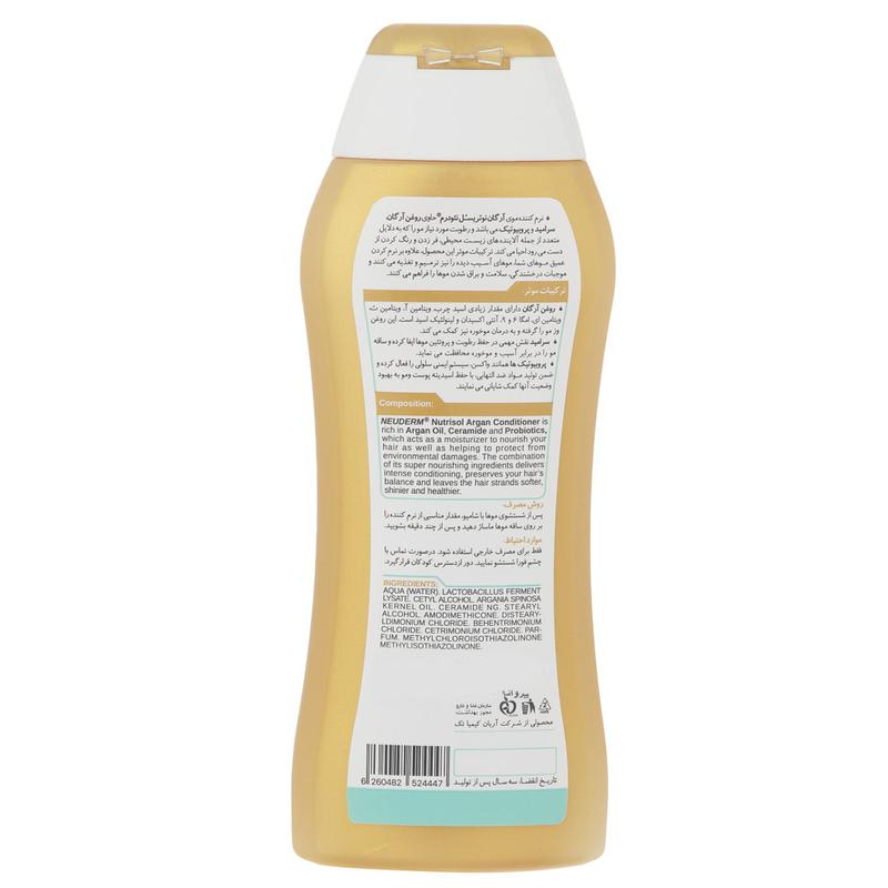 نرم کننده موی سر آرگان نئودرم (Neuderm) حاوی روغن آرگان، پروبیوتیک و سرامید می باشد و رطوبت مورد نیاز مو ها را که به دلایل متعددی از جمله آلاینده های زیست محیطی، مواد فر و رنگ کردن را که از دست می رود را احیا می کند. این ترکیب فوق العاده علاوه بر نرم کنندگی مو ها، به آن ها درخشندگی و براق بودن را نیز هدیه می دهد. روغن آرگان دارای اسید چرب، ویتامین A، ویتامین E و ویتامین C آنتی اکسیدان و لینولئیک اسید بسیار بالایی است. این محصول کاملا ایرانی می باشد و توسط متخصصین با تجربه ایرانی مناسب با آب و هوای کشورمان تولید شده است و می توانید با خیال راحت از آن استفاده نمایید.