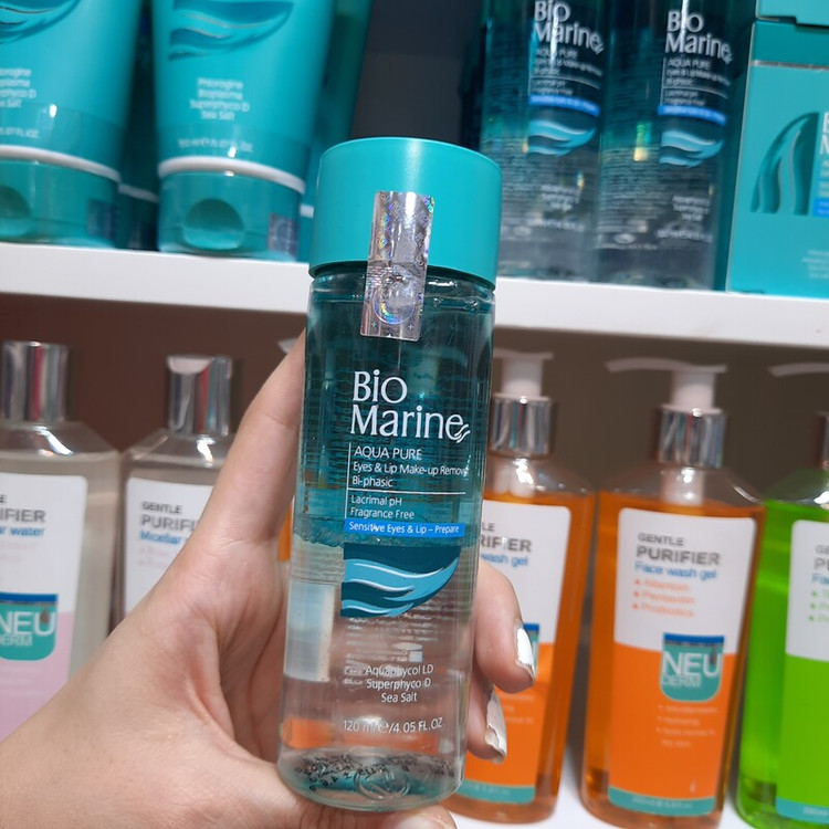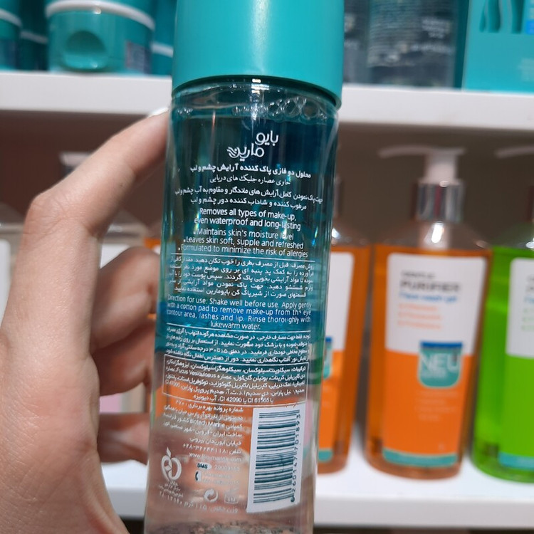 پاک کننده، مرطوب کننده، شاداب کننده پوست دور چشم و لب محلول دو فازی پاک کننده آرایش چشم و لب بایومارین، به پاک کردن انواع مواد آرایشی ضد آب و با ماندگاری طولانی مدت از سطح پوست شما کمک می نماید. این فرآورده با منشأ گیاهان دریایی، علاوه بر خاصیت پاک کنندگی بدون ایجاد حساسیت و خارش، با مرطوب نگه داشتن نواحی اطراف لب و چشم هایتان، موجب شادابی و طراوات پوستتان می گردد. قبل از مصرف بطری را خوب تکان دهید. مقدار کافی از فرآورده را به کمک پد پنبه ای روی موضع مورد نظر، استفاده نموده تا مواد آرایشی به خوبی پاک گردند. سپس پوست خود را با آب ولرم شستشو دهید (هر چشم با پنبه جداگانه، پاک شود).